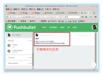 在 Firefox 瀏覽器中,即可看到手機傳來的訊息。如下圖。